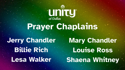 Our Prayer Chaplains are members of Unity of Dallas who feel “called” to serve as a chaplain. They have had special training and experience in praying with others. Prayer Chaplains hold all prayer requests in strict confidence.